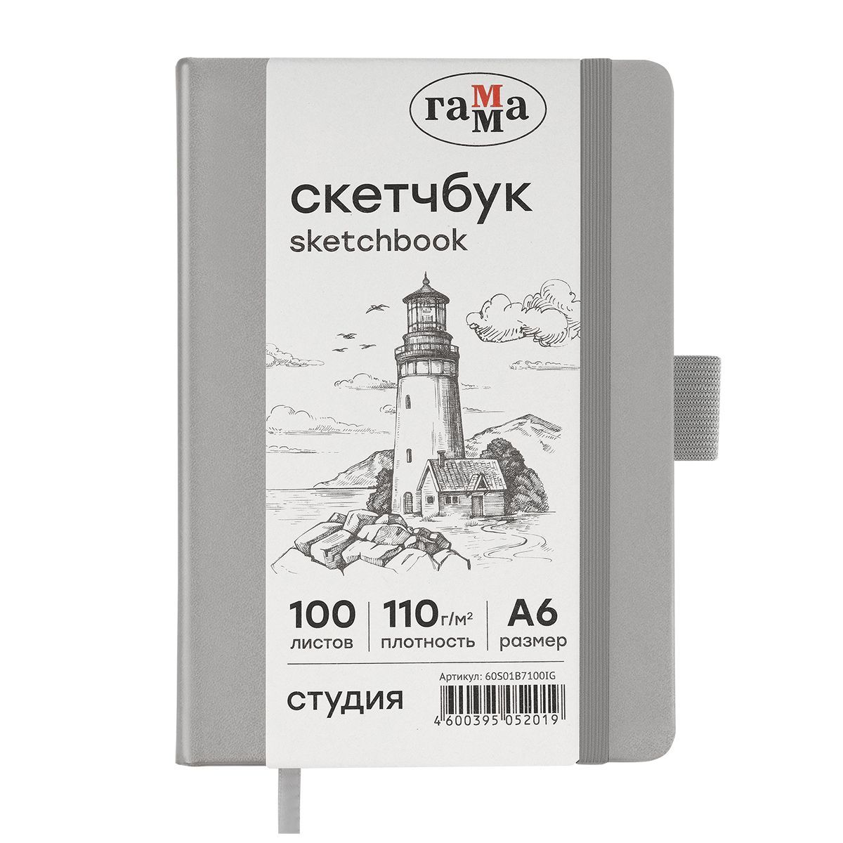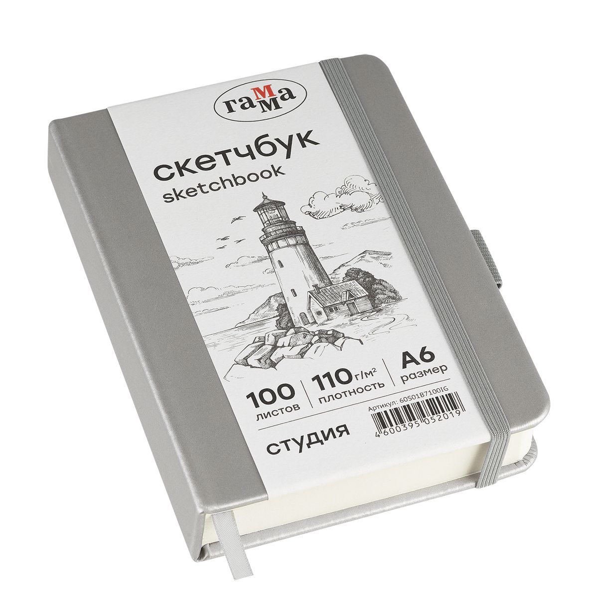 Скетчбук 100л., А6 Гамма "Студия", серебро, твердая обложка, на резинке, слоновая кость, 110г/м2