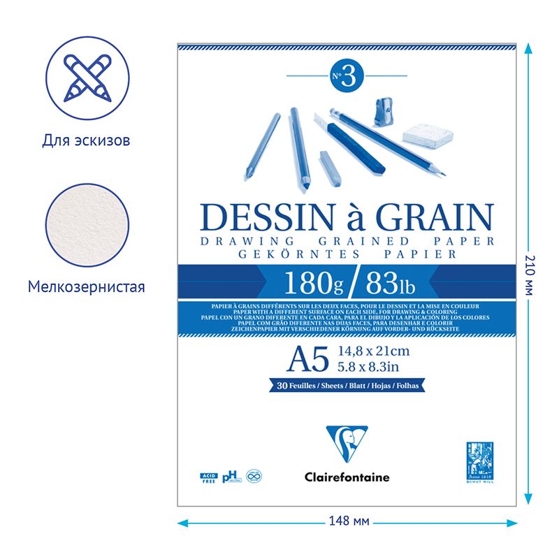 Скетчбук 30л., А5 Clairefontaine "Dessin a grain", на склейке, мелкозернистая, 180г/м2