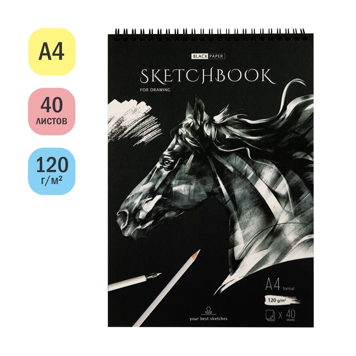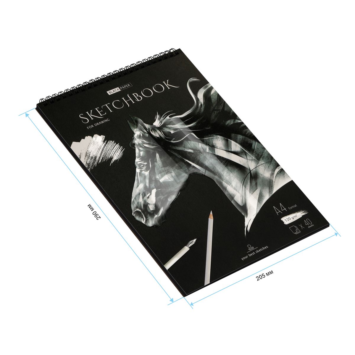 Скетчбук 40л., А4 ArtSpace "Black line. Horse", на гребне, черный блок, 120г/м2