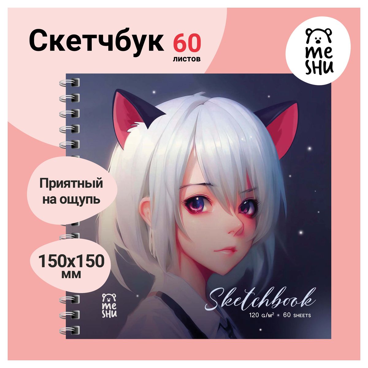 Скетчбук 60л., 150*150 MESHU "Neko", на гребне, выб. лак, soft-touch, 120г/м2
