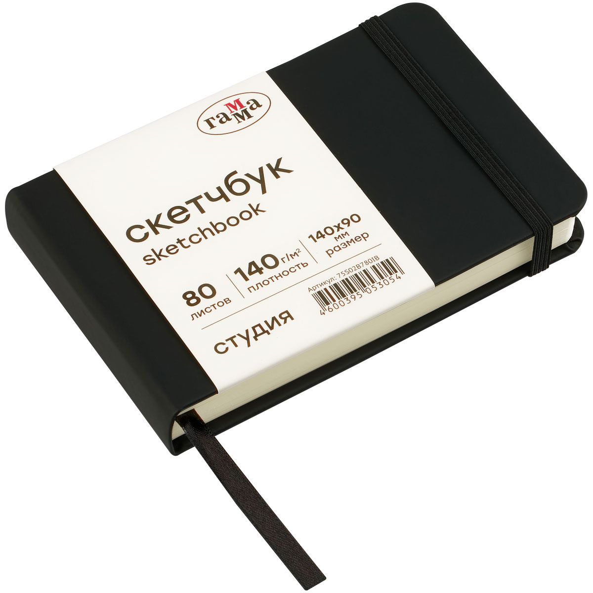 Скетчбук 80л., 140*90 Гамма "Студия", черный, твердая обложка, на резинке, слоновая кость, 140г/м2