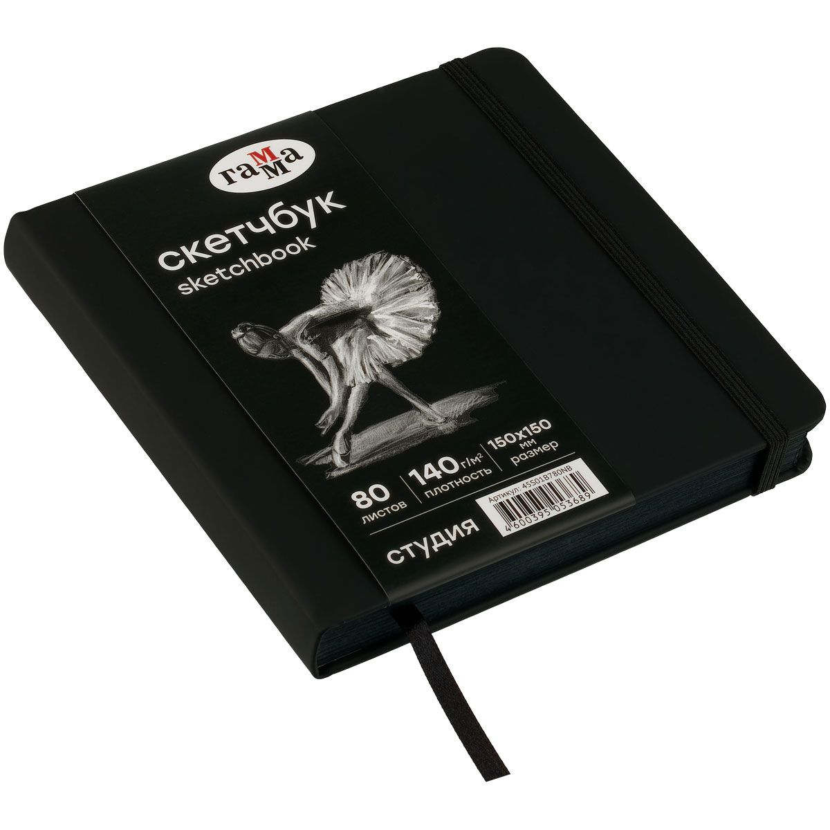 Скетчбук 80л., 150*150 Гамма "Студия", черный, твердая обложка, на резинке, черная, 140г/м2