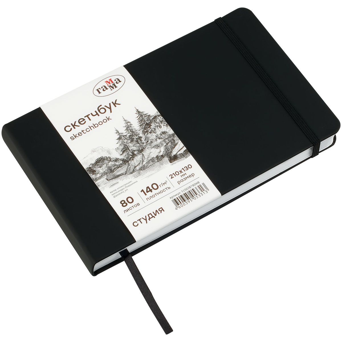 Скетчбук 80л., 210*130 Гамма "Студия", черный, твердая обложка, на резинке, белая, 140г/м2