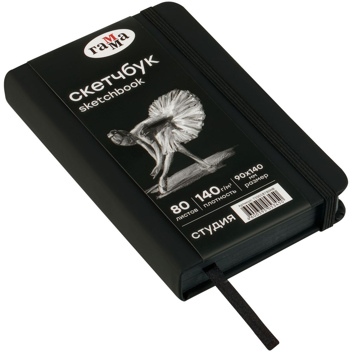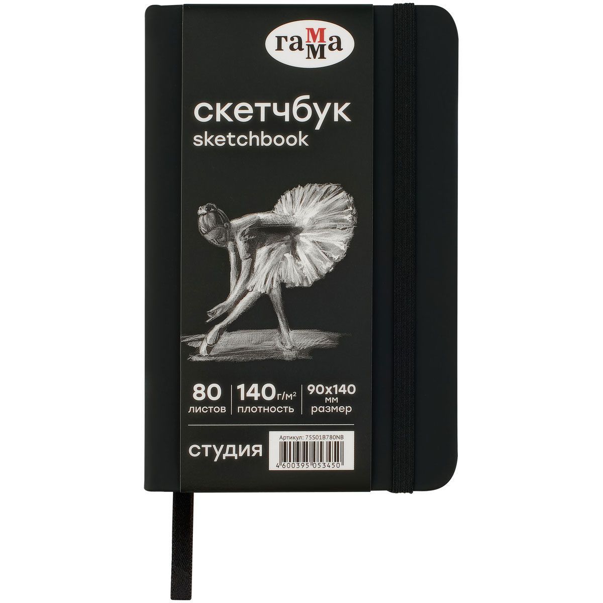 Скетчбук 80л., 90*140 Гамма "Студия", черный, твердая обложка, на резинке, черная, 140г/м2