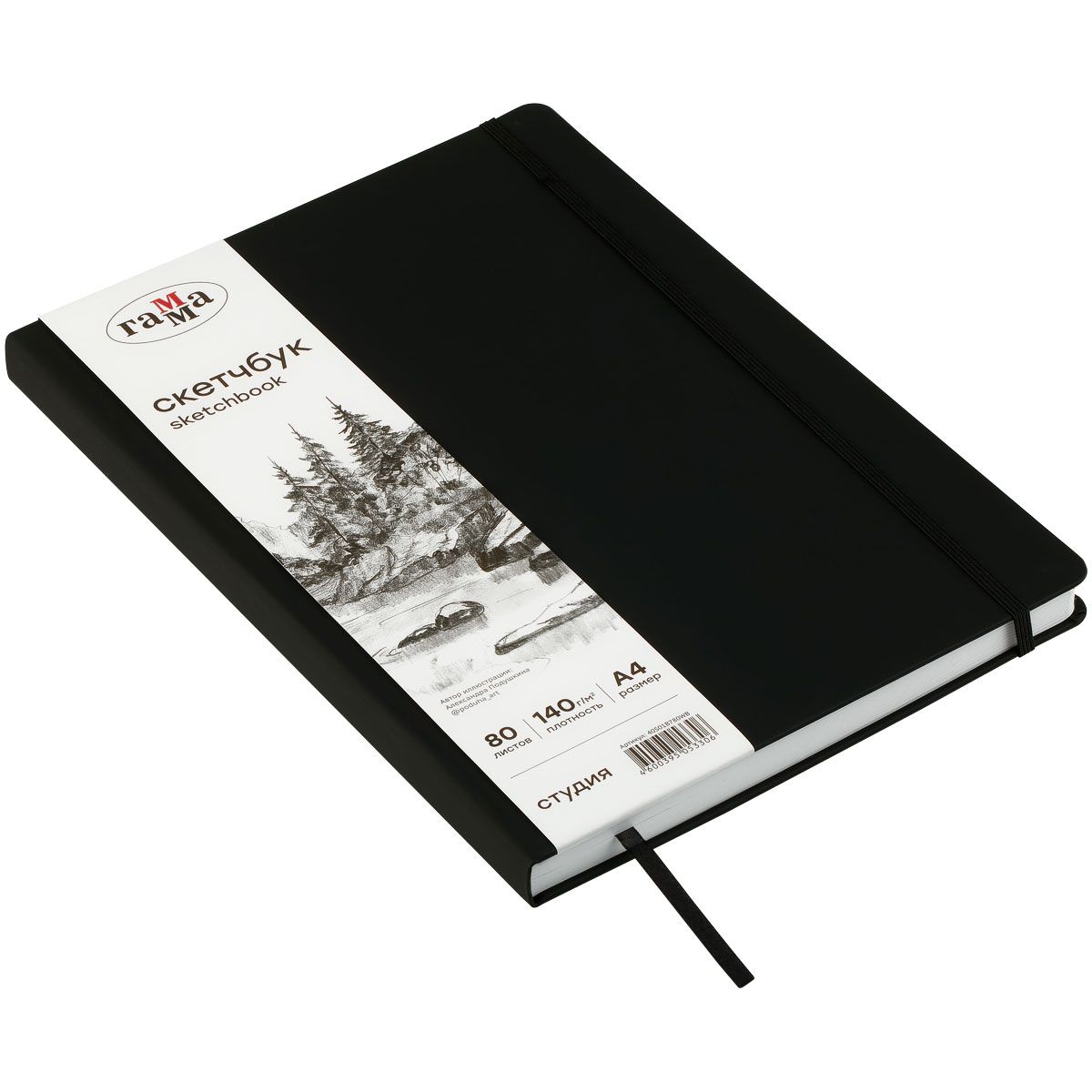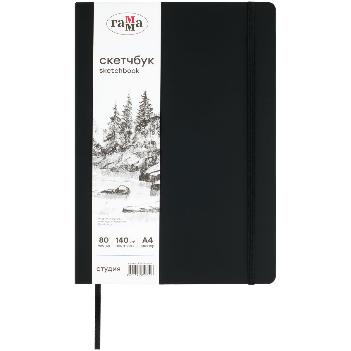 Скетчбук 80л., А4 Гамма "Студия", черный, твердая обложка, на резинке, белая, 140г/м2