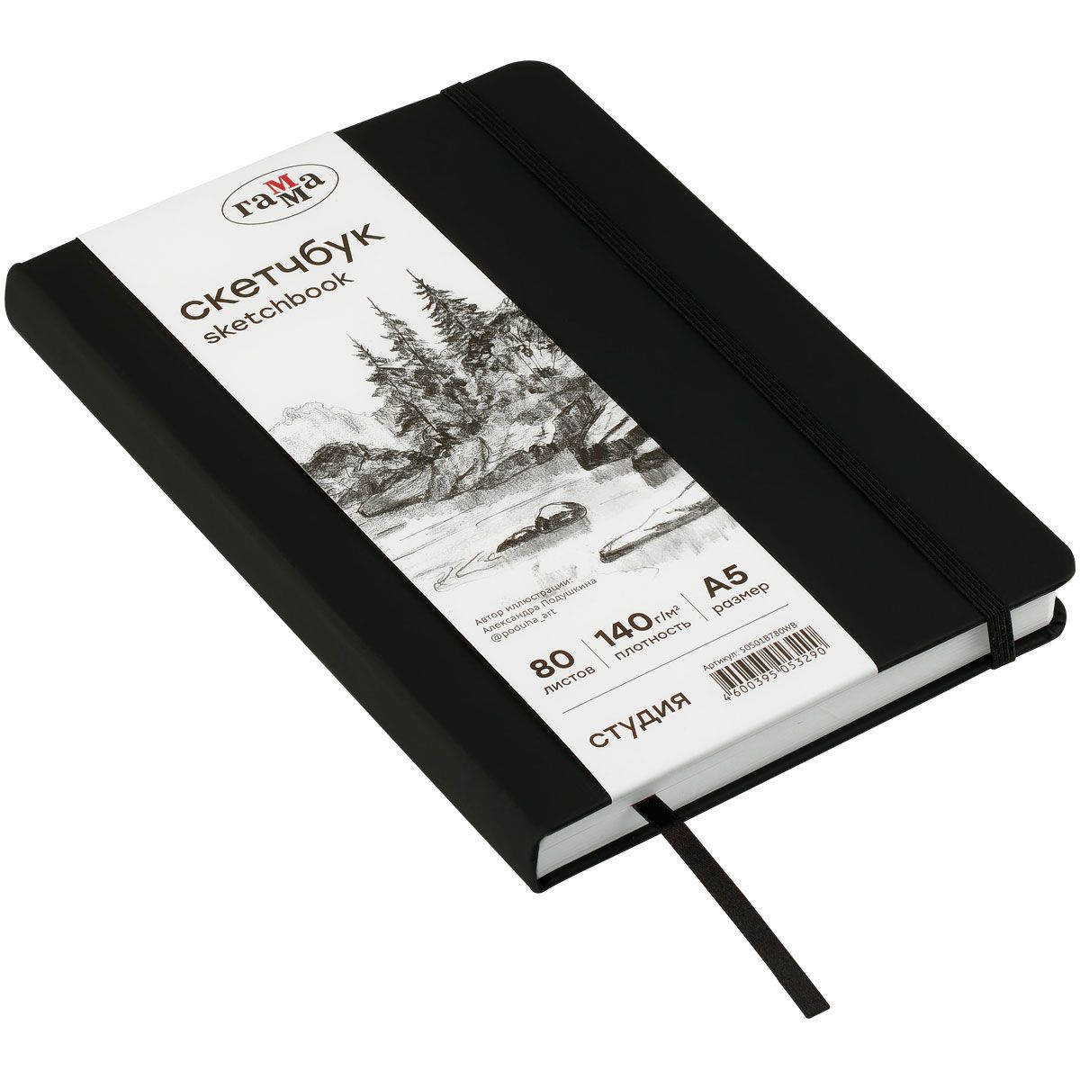 Скетчбук 80л., А5 Гамма "Студия", черный, твердая обложка, на резинке, белая, 140г/м2