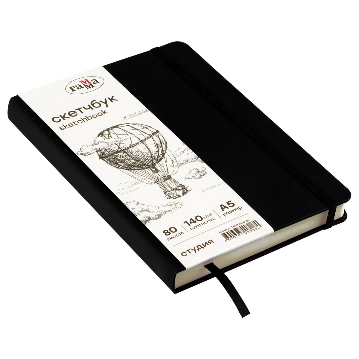Скетчбук 80л., А5 Гамма "Студия", черный, твердая обложка, на резинке, слоновая кость, 140г/м2