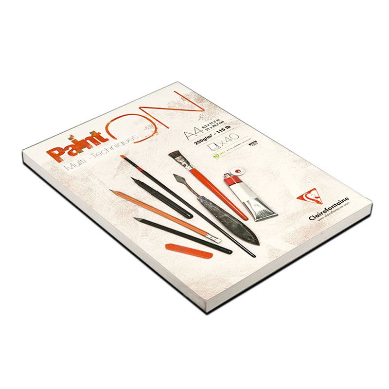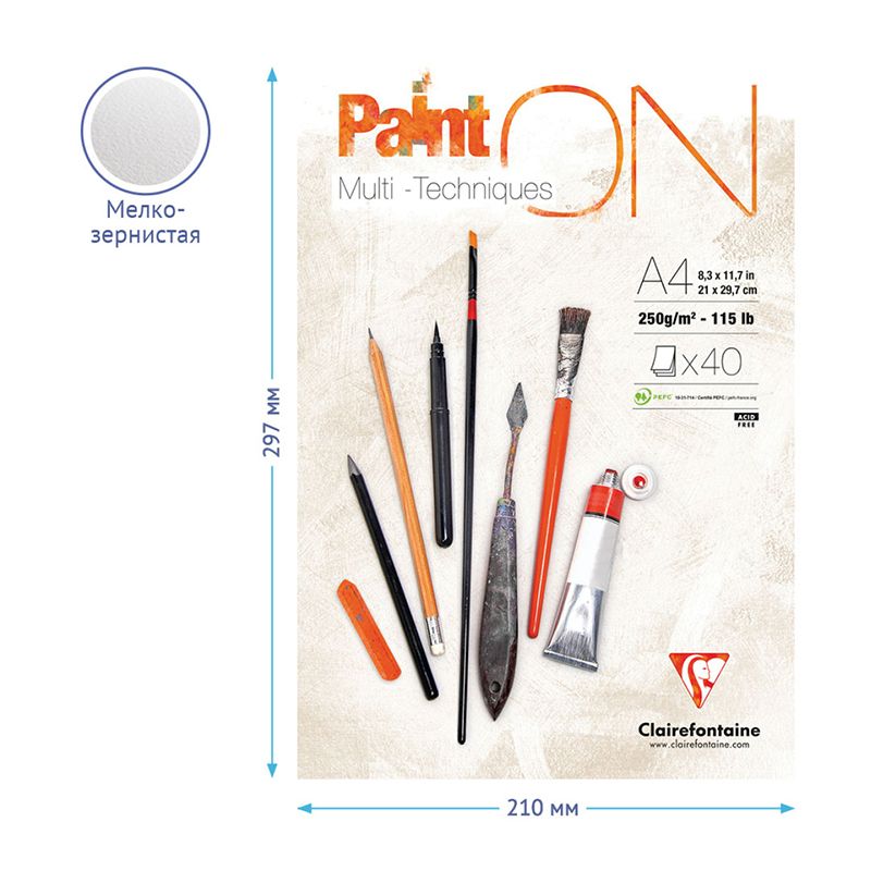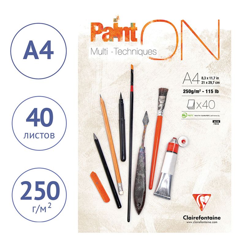 Скетчбук - альбом для смешанных техник 40л., А4, на склейке Clairefontaine "Paint'ON", мелкозерн., 250г/м2