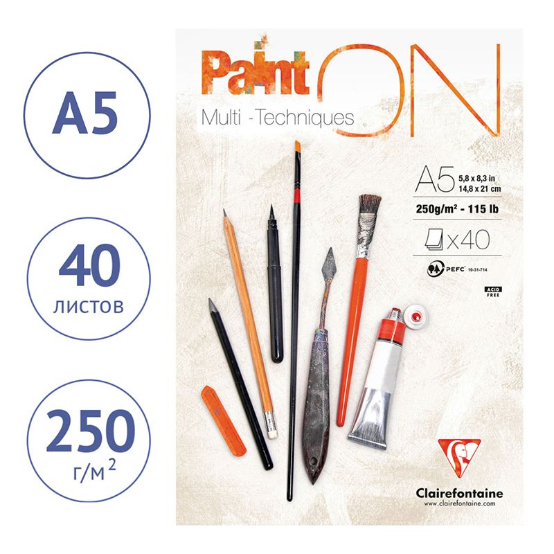 Скетчбук - альбом для смешанных техник 40л., А5, на склейке Clairefontaine "Paint'ON", мелкозерн. 250г/м2