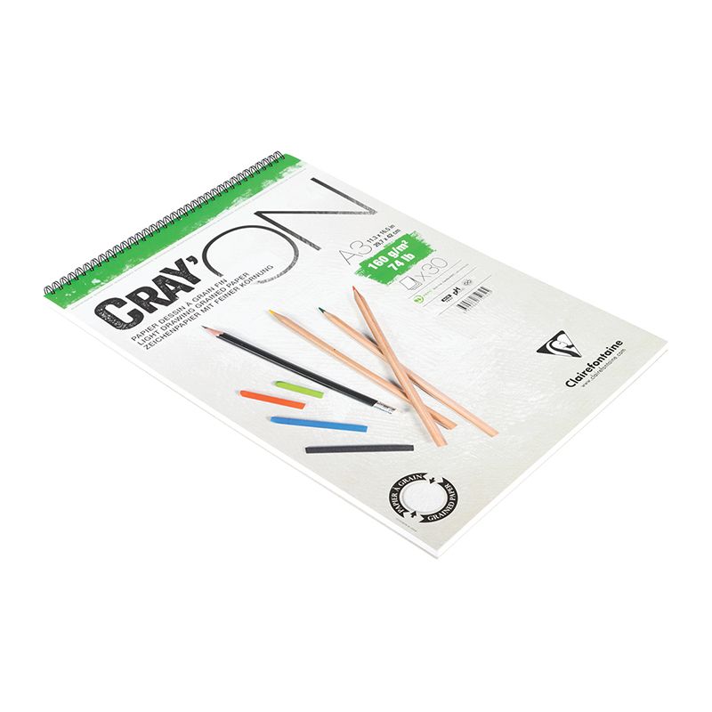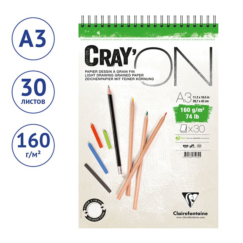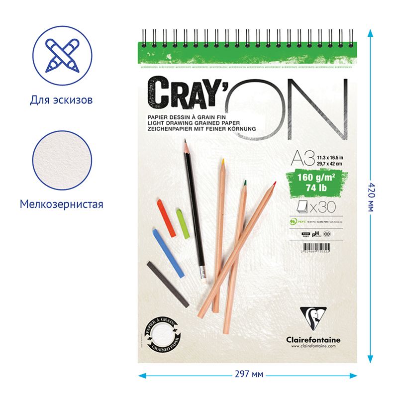 Скетчбук - блокнот 30л., А3 Clairefontaine "Cray ON", на гребне, мелкозерн., 160г/м2