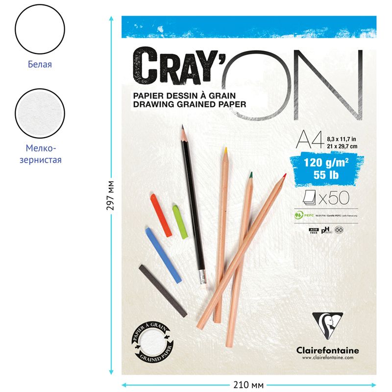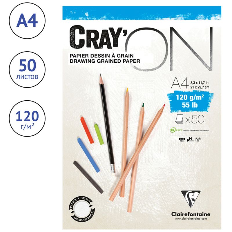 Скетчбук - блокнот 50л., А4 Clairefontaine "Cray ON", на склейке, мелкозерн., 120г/м2
