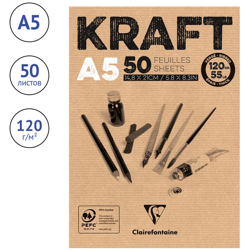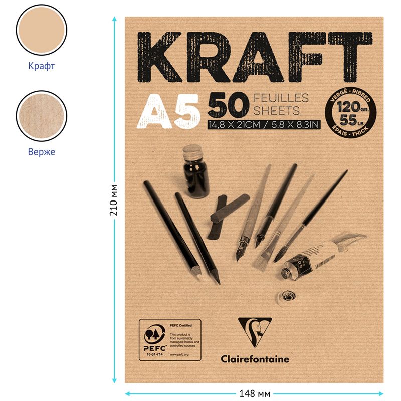 Скетчбук - блокнот 50л., А5 Clairefontaine "Kraft", на склейке, верже, крафт, 120г/м2