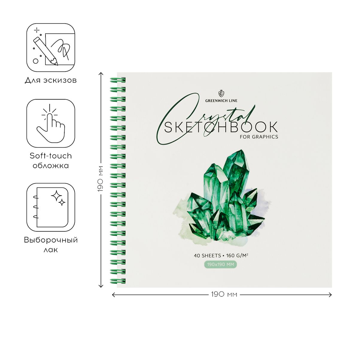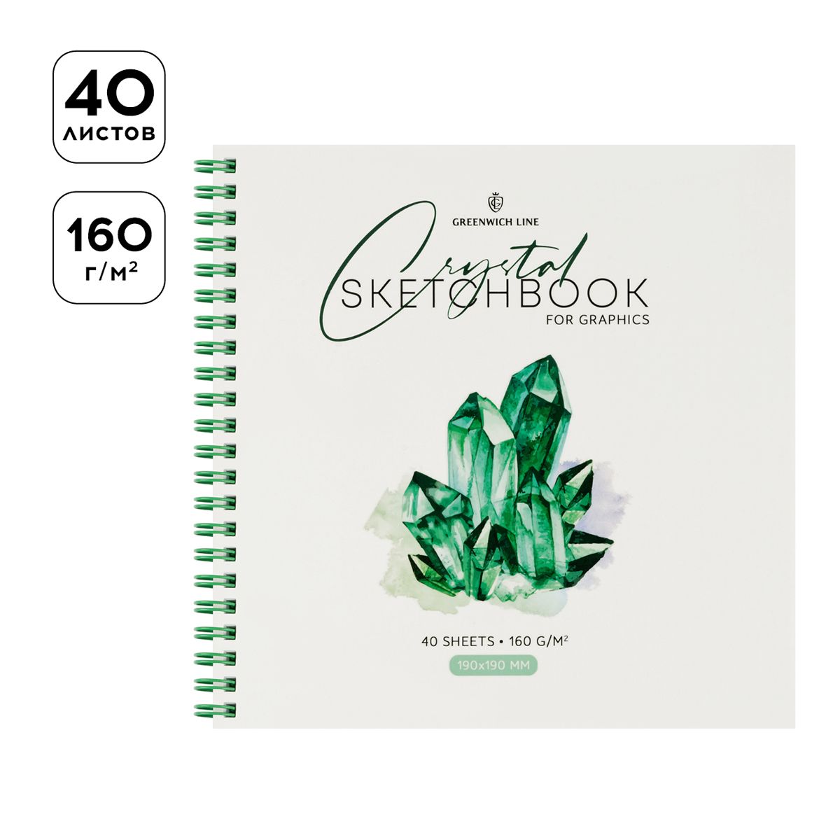 Скетчбук для графики и эскизов 40л., 190*190 Greenwich Line "Crystal. Emerald Stone", на гребне, 160г/м2