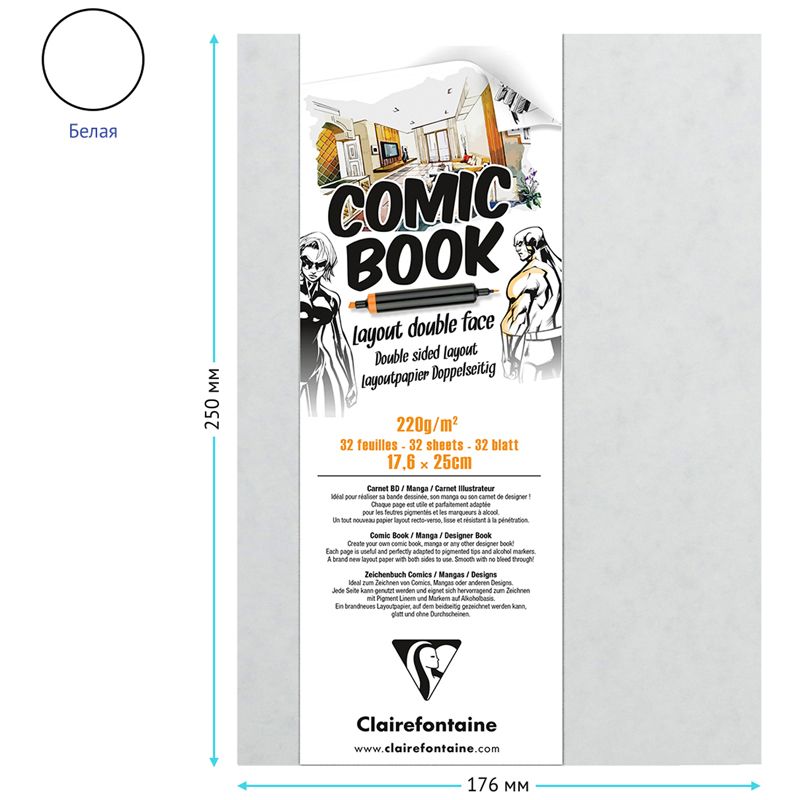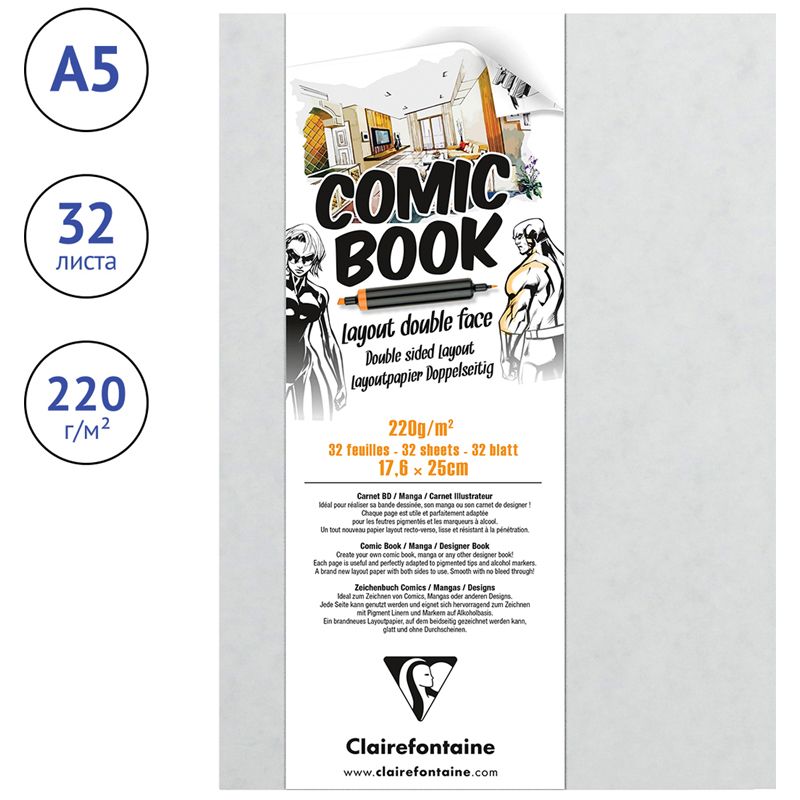 Скетчбук для маркеров 32л., 176*250 Clairefontaine "Comic book", на склейке, 220г/м2