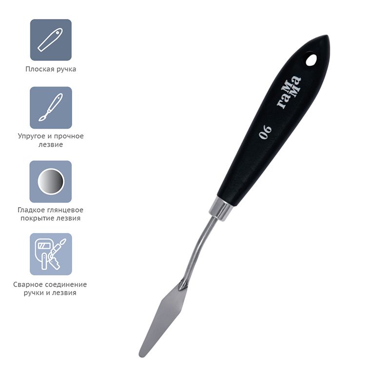 Паяный мастихин из нержавеющей стали с удобной плоской ручкой из натурального бука. Сварное соединение ручки и лезвия дает больший угол наклона мастихина к холсту, снижая вероятность случайного касания и смазывания краски.