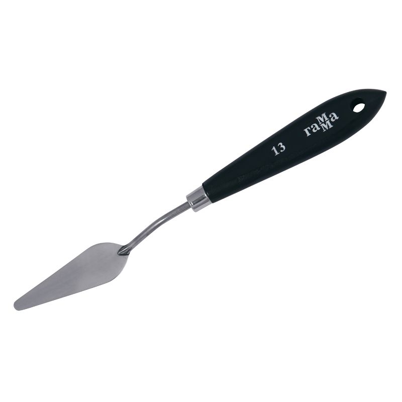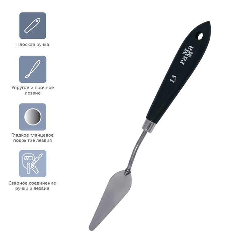 Паяный мастихин из нержавеющей стали с удобной плоской ручкой из натурального бука. Сварное соединение ручки и лезвия дает больший угол наклона мастихина к холсту, снижая вероятность случайного касания и смазывания краски.