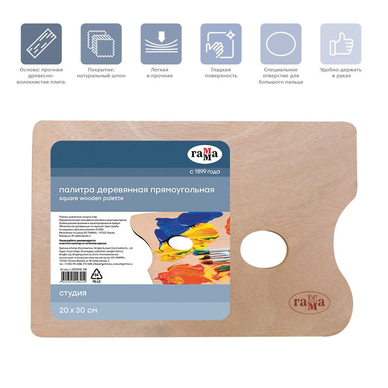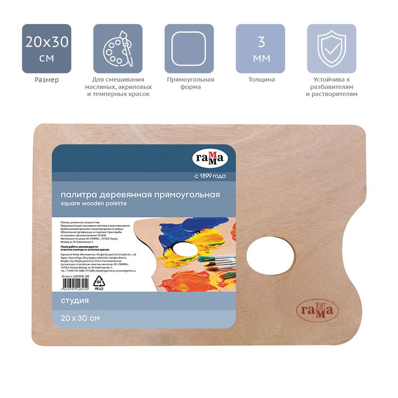 Палитра деревянная прямоугольная Гамма "Студия", 20*30см, толщина 3мм