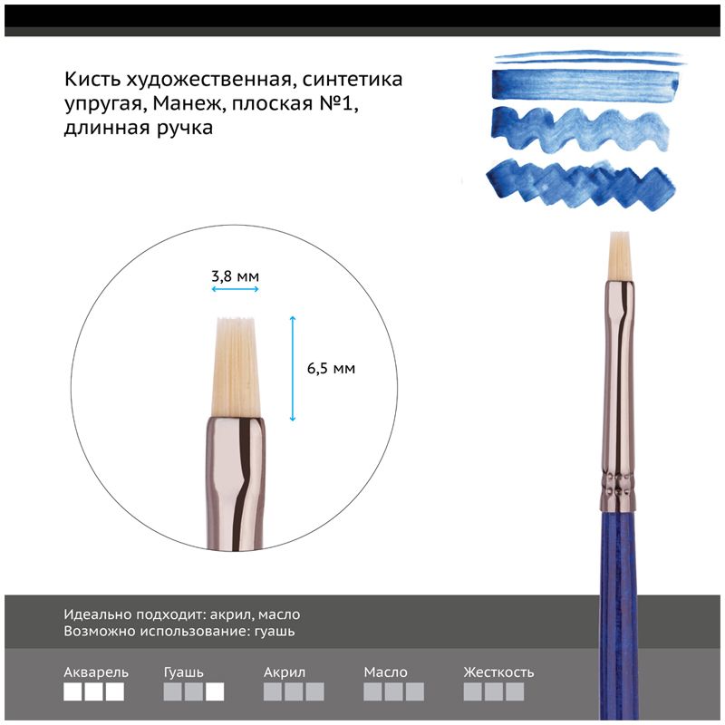 Кисть художественная синтетика упругая Гамма "Манеж", плоская №1, длинная ручка