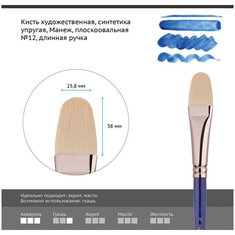 Кисть художественная синтетика упругая Гамма "Манеж", плоскоовальная №12, длинная ручка