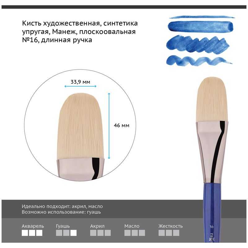 Кисть художественная синтетика упругая Гамма "Манеж", плоскоовальная №16, длинная ручка