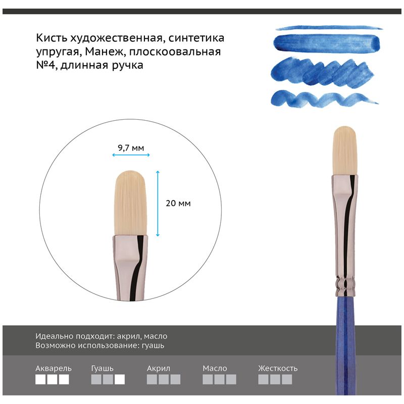 Кисть художественная синтетика упругая Гамма "Манеж", плоскоовальная №4, длинная ручка