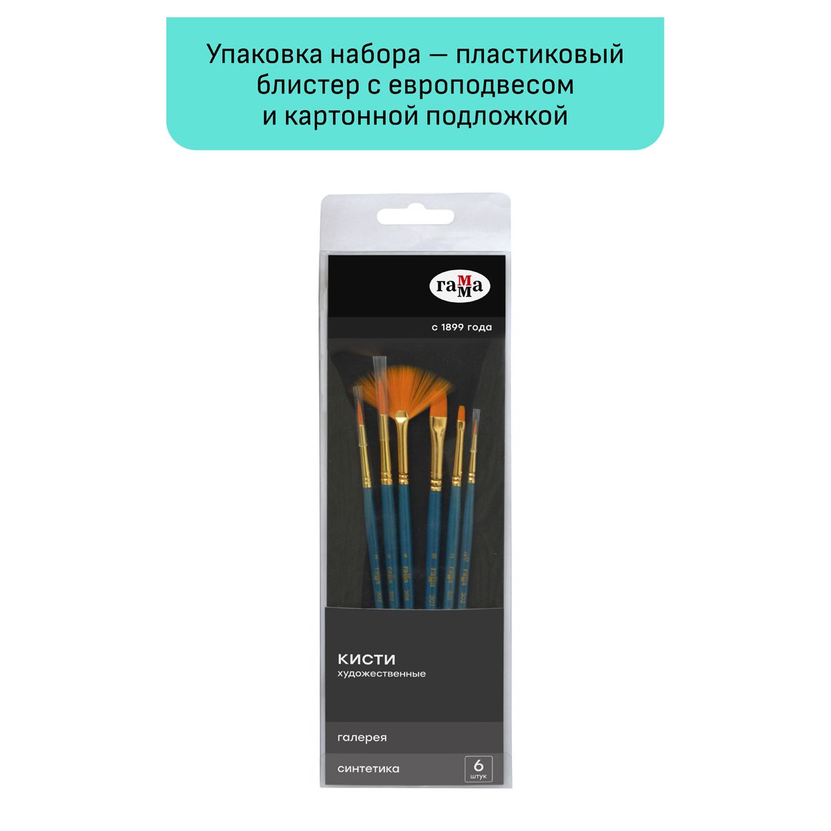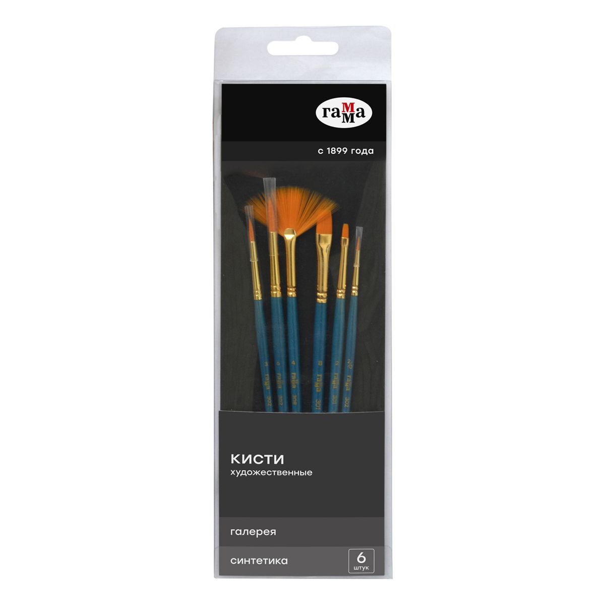 Набор художественных кистей синтетика Гамма "Галерея", 6шт., круглые №2/0, 3, 6, плоские №2, 8, веерные № 4, блистер, европодвес