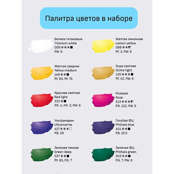 • Светостойкость и долговечность — обращайте внимание на маркировку, если работа будет экспонироваться в светлом помещении или на длительное хранение.