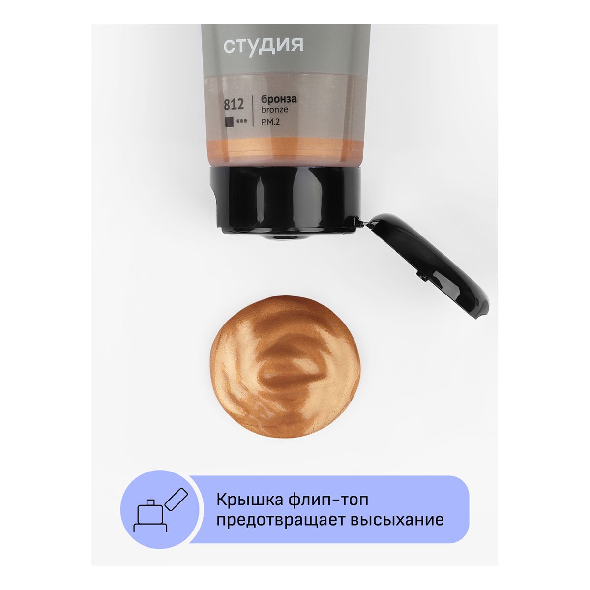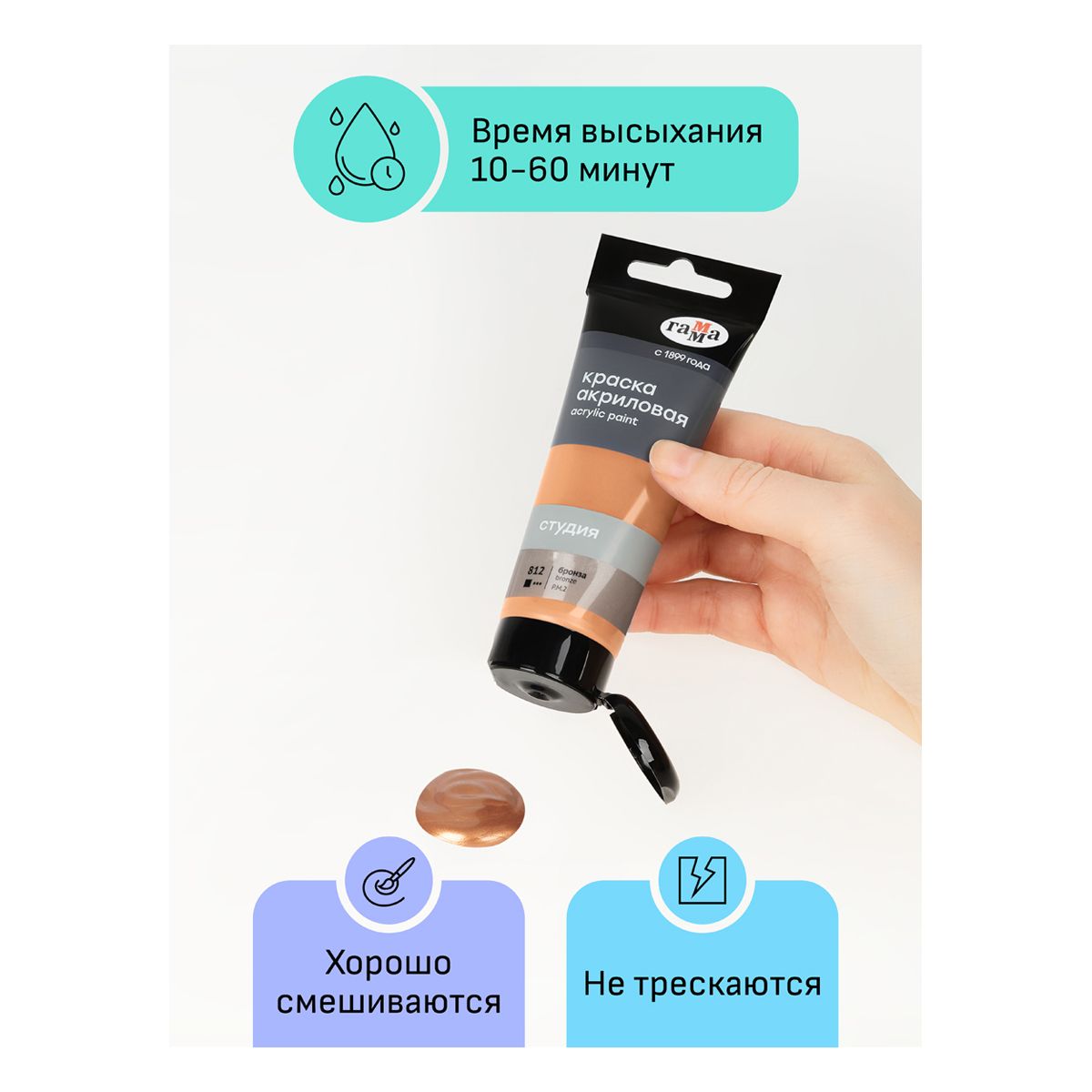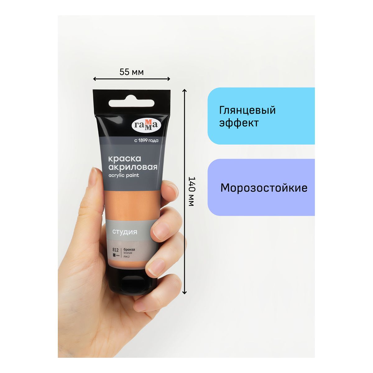 Акриловая краска «ГАММА» серии «Студия» бронза предназначена для художественно-живописных и декоративно-прикладных работ. Главные отличия: насыщенный цвет и металлический отблеск краски, высокая адгезия, прочность красочного слоя. После высыхания краска становится глянцевой, практически не темнеет, специальная добавка позволяет максимально раскрыть красоту цвета. Художественный акрил прекрасно разносится, подходит для бумаги, картона, грунтованного холста, дерева, стекла, кожи, ткани. Время высыхания: от 10 минут до 1 часа в зависимости от толщины слоя. Прозрачный корпус тубы позволяет увидеть цвет краски, а удобная крышка флип-топ предотвращает высыхание. Объём тубы — 75 мл.
