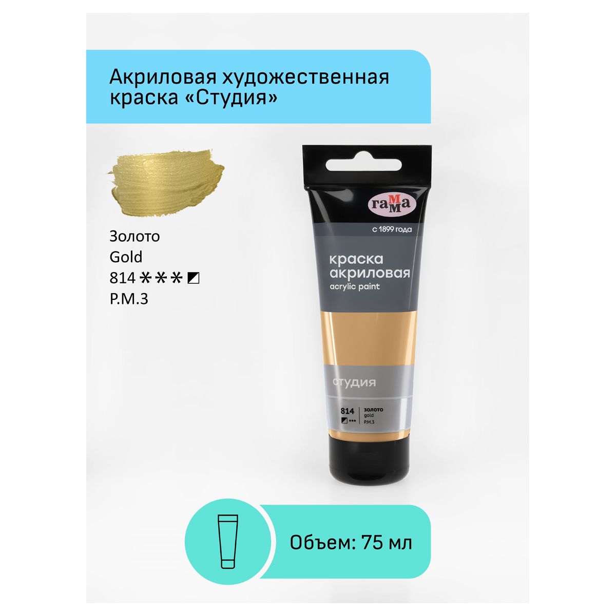 Краска акриловая художественная Гамма "Студия", 75мл, пластиковая туба, золото