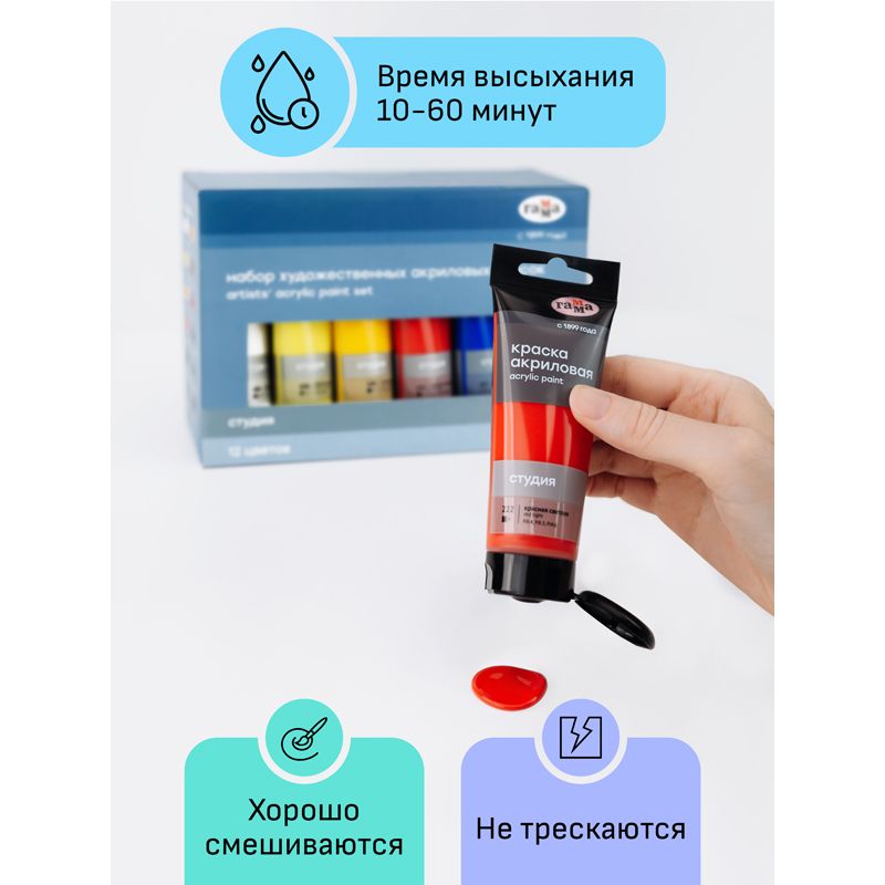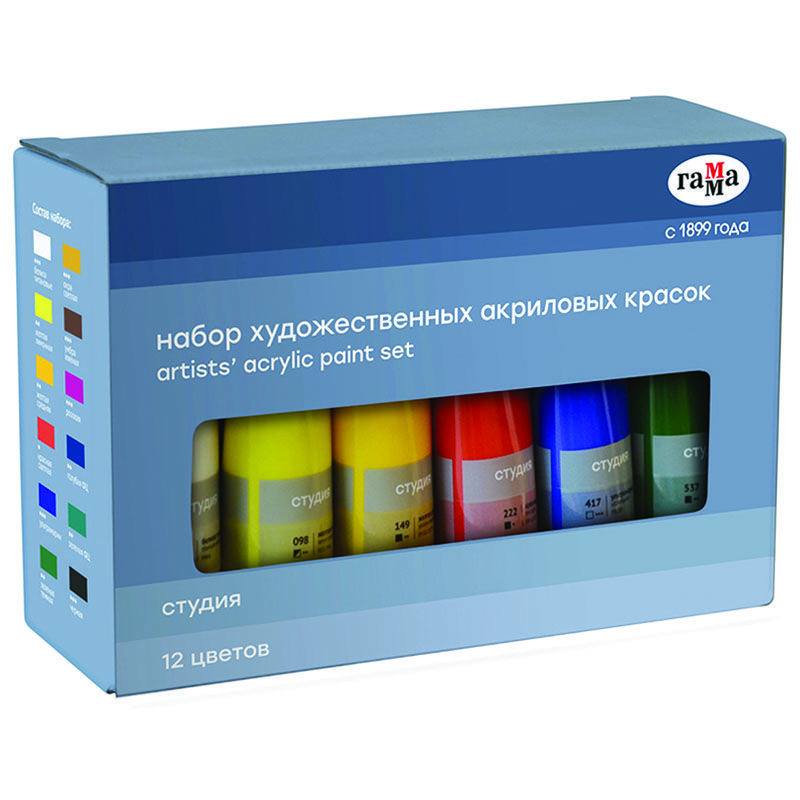 Краски акриловые художественные Гамма "Студия", 12цв., 75мл/туба, картон. упаковка