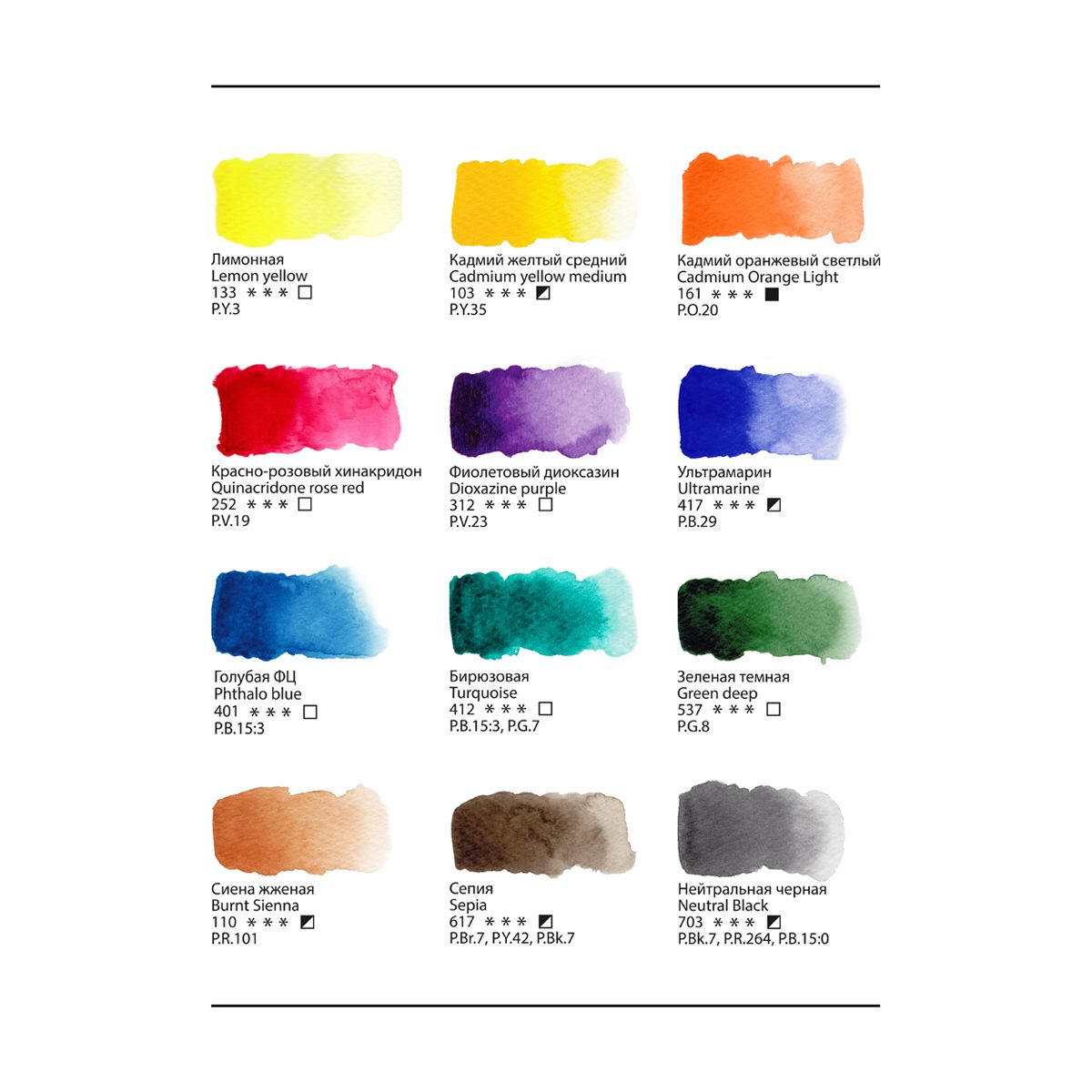 Маркировка светостойкости, колор-индекса и укрывистисти указан на упаковке. Акварельные краски профессиональной серии "Старый мастер" разработаны в собственной исследовательской лаборатории завода на основе гуммиарабика высшего качества.
