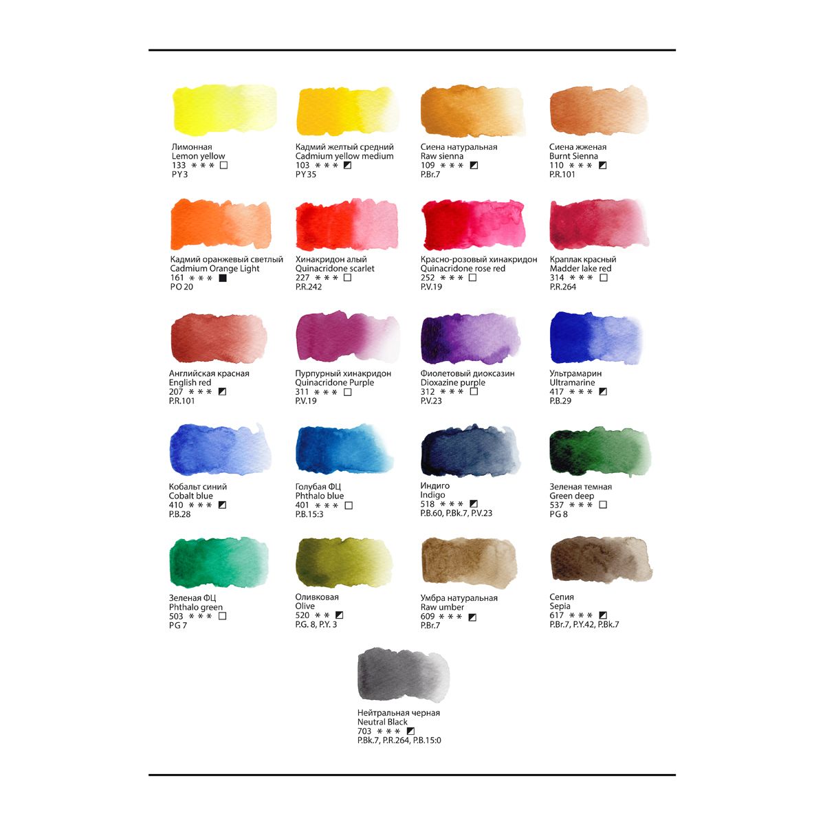 Профессиональная акварель серии «Старый мастер» разработана в собственной исследовательской лаборатории завода. Краски изготовлены на основе органических и неорганических пигментов и гуммиарабика высшего качества. Цвета акварельных красок звонкие, чистые, прозрачные. Краски высокопигментированные, интенсивные, легко набираются на кисть. Маркировка светостойкости, колор-индекса и укрывистости указана на упаковке. Акварель отлично подойдет как профессионалам, так и начинающим художникам.