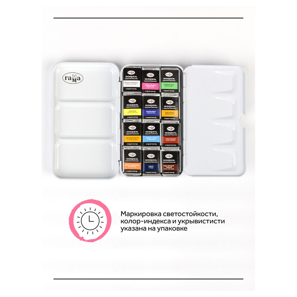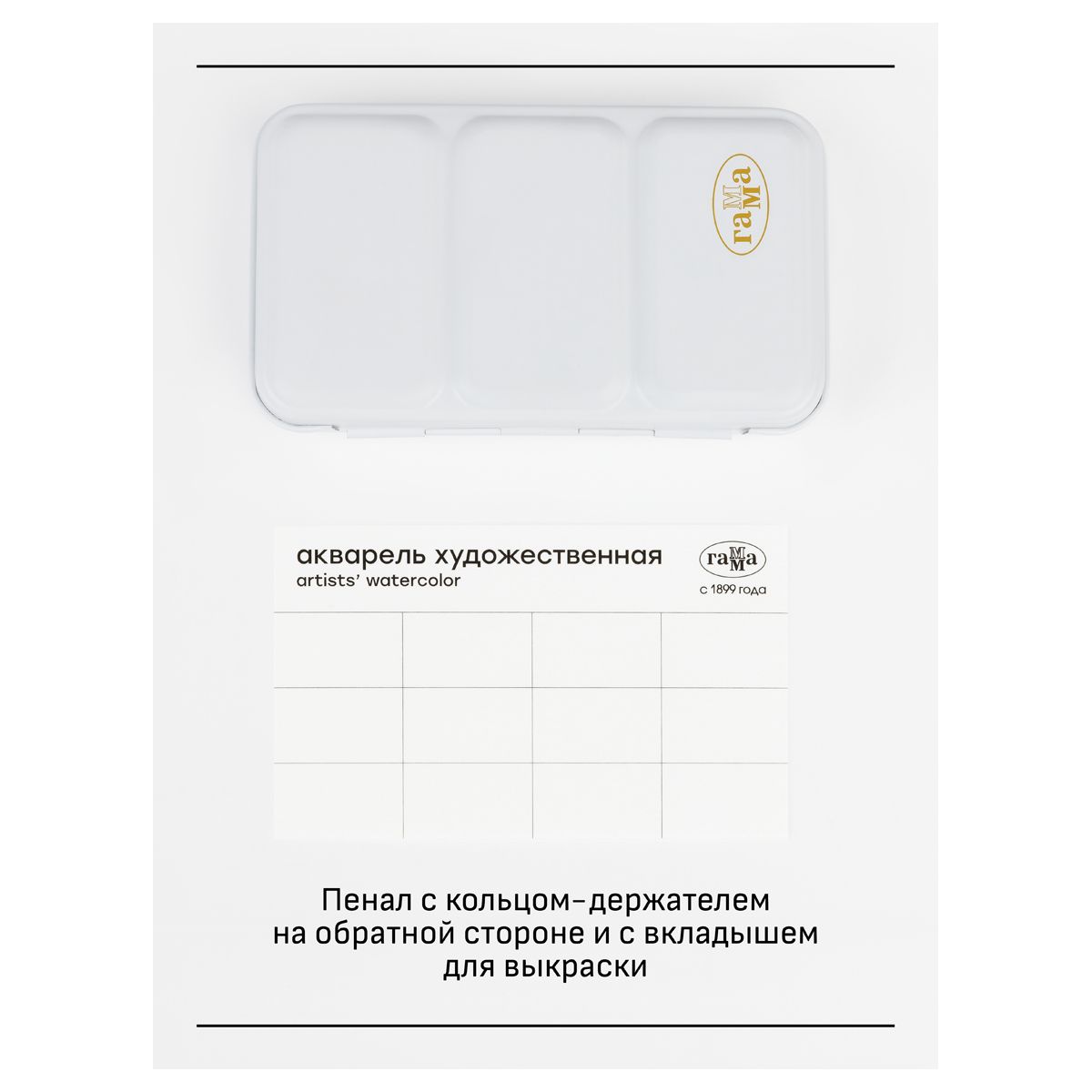 Набор представлен в металлическом пенале с удобными креплениями кювет, палитрой и кольцом-держателем на обратной стороне.