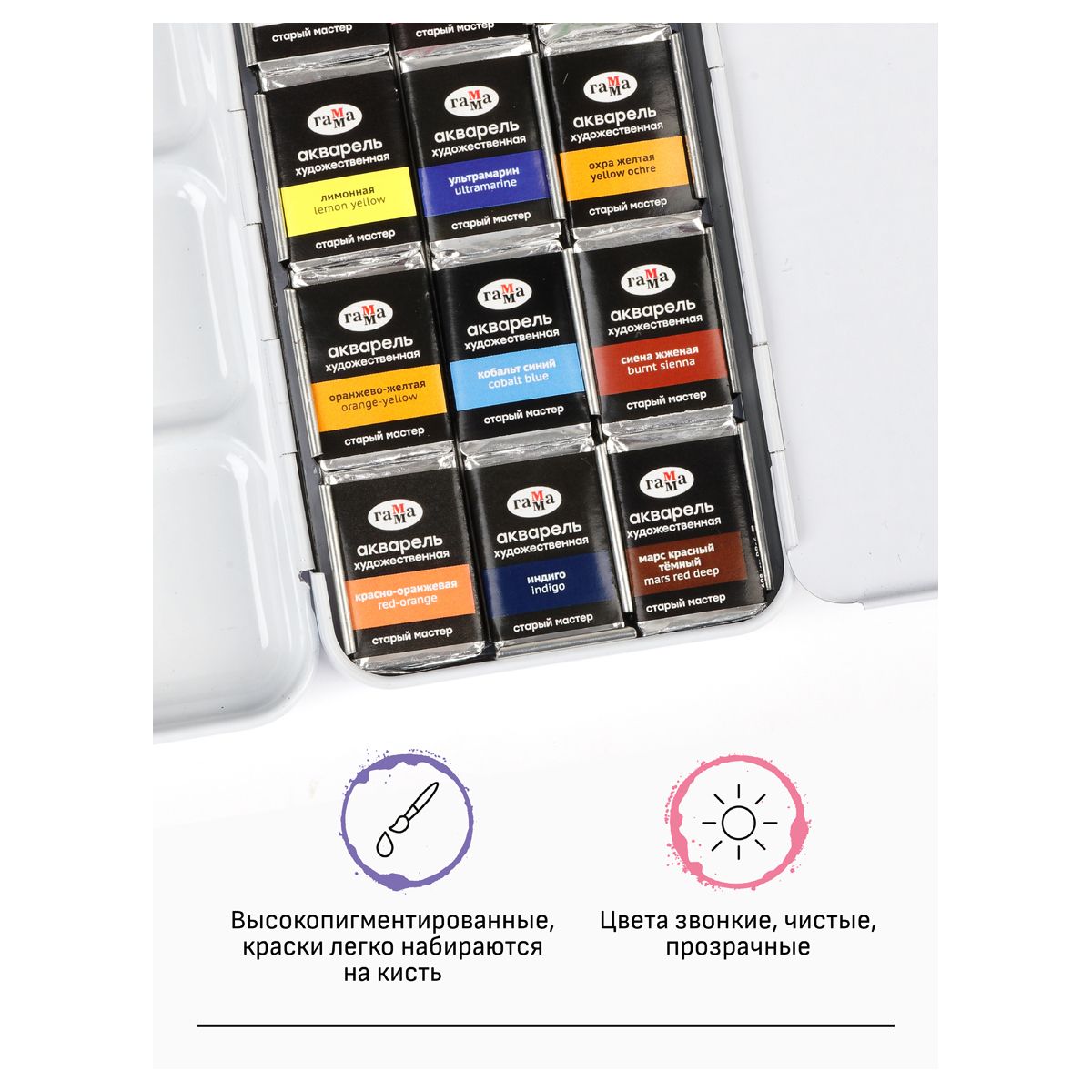 Профессиональная акварель серии «Старый мастер» разработана в собственной исследовательской лаборатории завода. Краски изготовлены на основе органических и неорганических пигментов и гуммиарабика высшего качества. Цвета акварельных красок звонкие, чистые, прозрачные. Краски высокопигментированные, интенсивные, легко набираются на кисть. Маркировка светостойкости, колор-индекса и укрывистости указана на упаковке. Акварель отлично подойдёт как профессионалам, так и начинающим художникам.