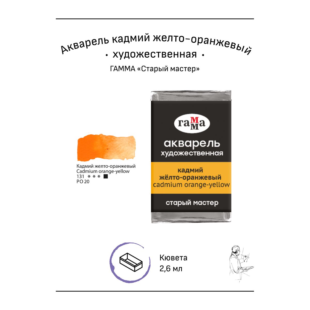 Акварель художественная Гамма "Старый мастер" кадмий желто-оранжевый, 2,6мл, кювета