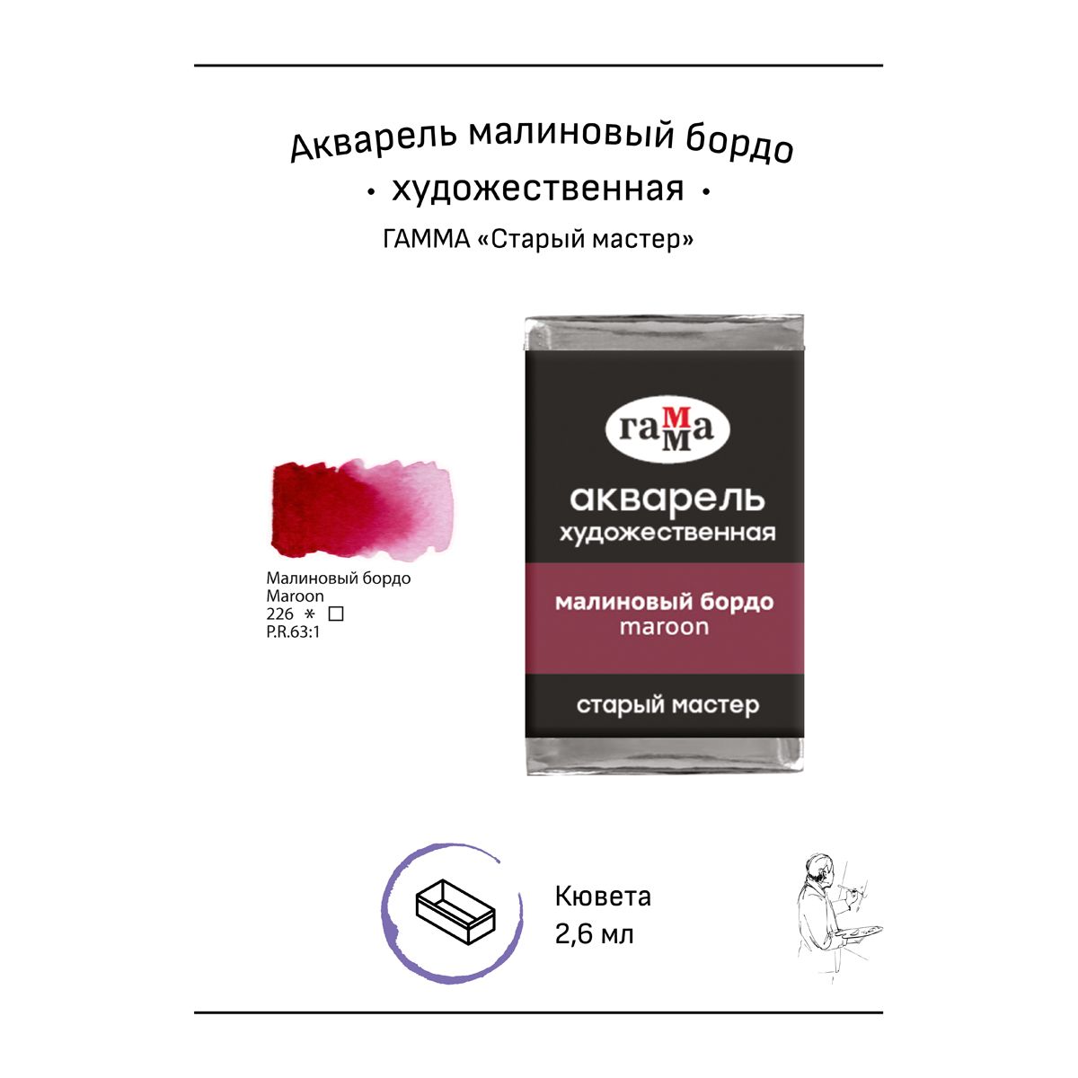 Акварель художественная Гамма "Старый мастер" малиновый бордо, 2,6мл, кювета