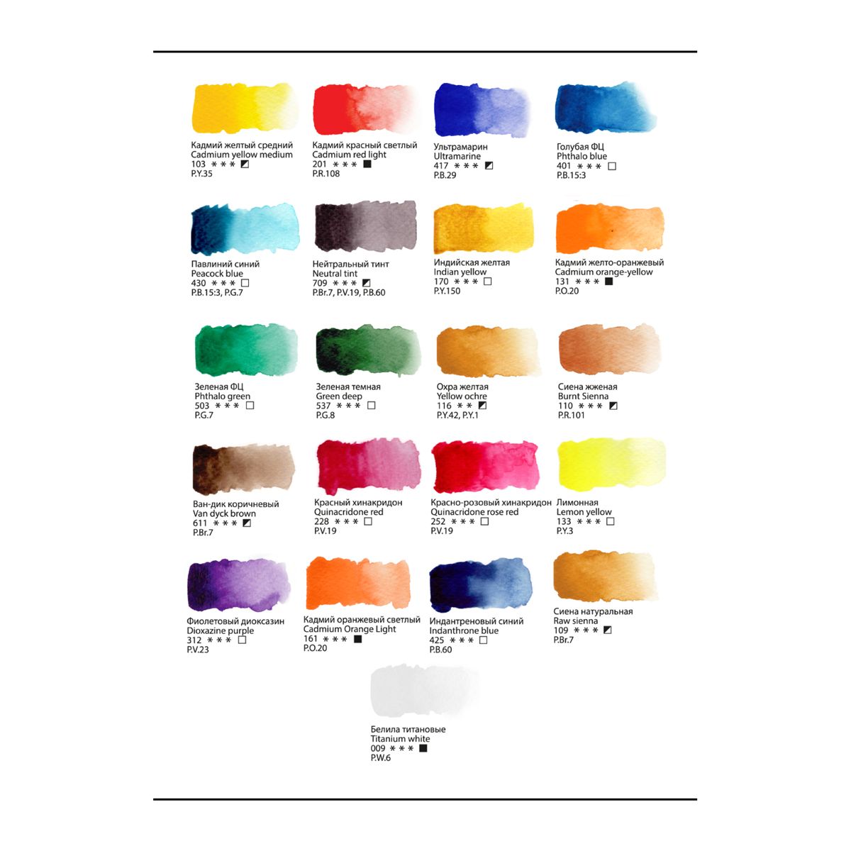 Профессиональная акварель серии «Старый мастер» разработана в собственной исследовательской лаборатории завода. Краски изготовлены на основе органических и неорганических пигментов и гуммиарабика высшего качества. Цвета акварельных красок звонкие, чистые, прозрачные. Краски высокопигментированные, интенсивные, легко набираются на кисть. Маркировка светостойкости, колор-индекса и укрывистости указана на упаковке. Акварель отлично подойдёт как профессионалам, так и начинающим художникам.