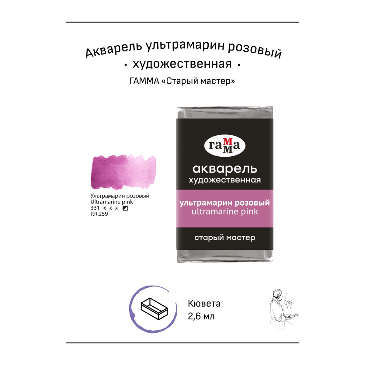 Акварель художественная Гамма "Старый мастер" ультрамарин розовый, 2,6мл , кювета