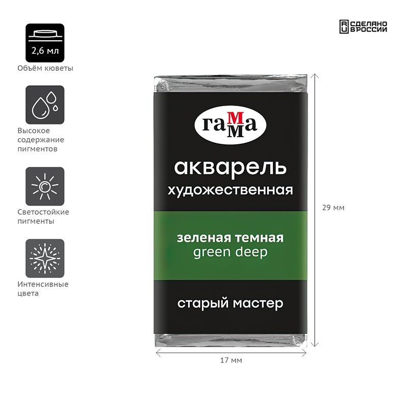 Акварель художественная Гамма "Старый Мастер" зеленая темная, 2,6мл, кювета