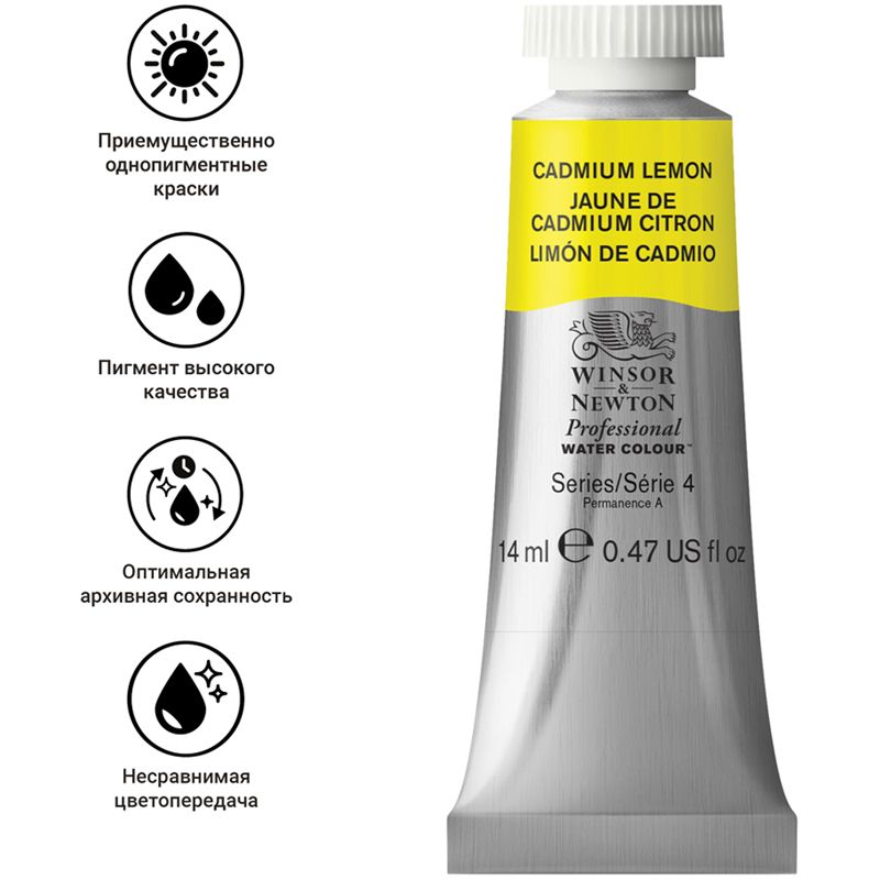 Для линейки акварельных красок Winsor&Newton Professional используются только лучшие пигменты, известные своей чистотой, светостойкостью и прочностью. Акварель имеет широкий цветовой спектр почти из 109 великолепных, проверенных временем оттенков. Кадмий лимонный – холодный жёлтый однопигментный цвет с высокой укрывистостью. Номер цвета, данный производителем – 086 пигмент(ы) – PY35, непрозрачная краска, светостойкость – стойкая, серия пигмента – 4. Краски Winsor&Newton Professional выпускаются в твёрдом варианте – в кюветах и в полутвёрдом – в тубах по 5 мл и 14 мл.