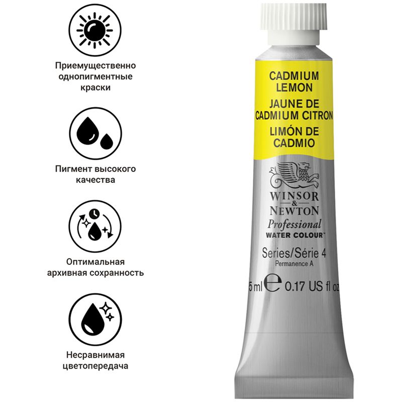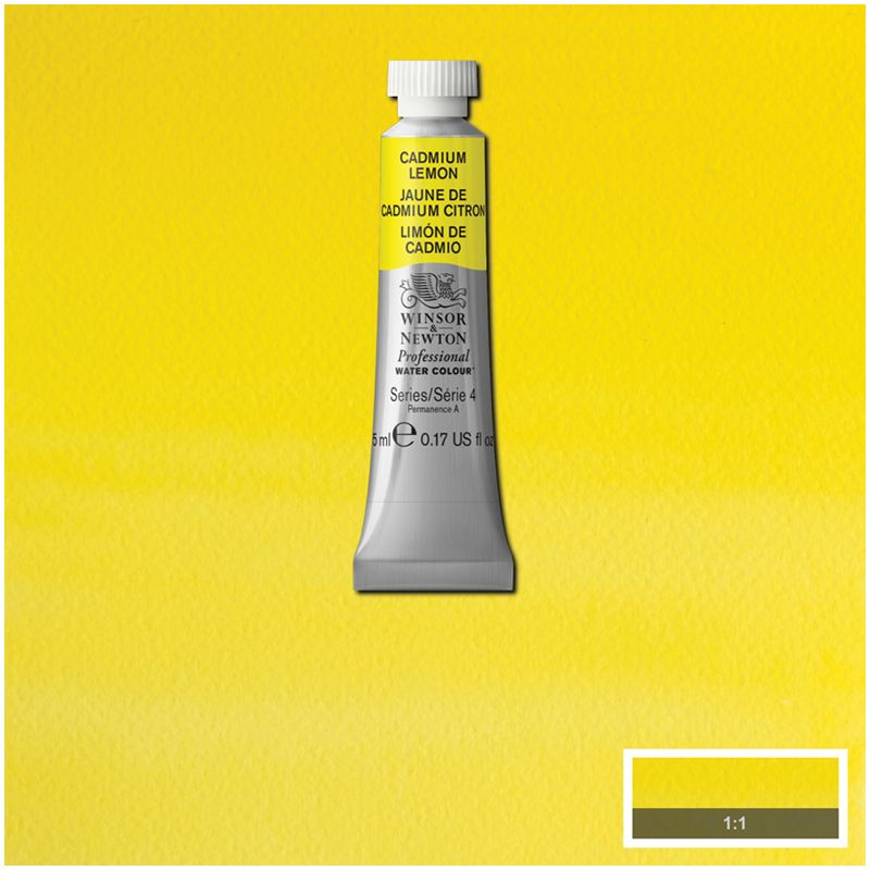 Для линейки акварельных красок Winsor&Newton Professional используются только лучшие пигменты, известные своей чистотой, светостойкостью и прочностью. Акварель имеет широкий цветовой спектр почти из 109 великолепных, проверенных временем оттенков. Кадмий лимонный – холодный жёлтый однопигментный цвет с высокой укрывистостью. Номер цвета, данный производителем – 086 пигмент(ы) – PY35, непрозрачная краска, светостойкость – стойкая, серия пигмента – 4. Краски Winsor&Newton Professional выпускаются в твёрдом варианте – в кюветах и в полутвёрдом – в тубах по 5 мл и 14 мл.