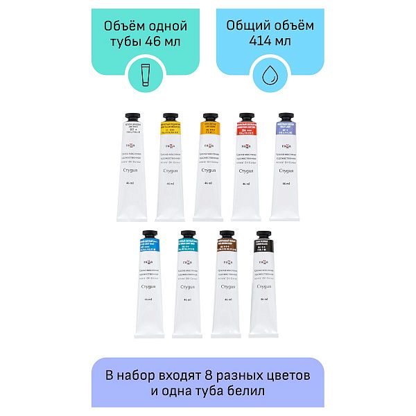 - Формат упаковки — тюбики от 5 до 60 мл подходят под разные задачи, большие объёмы удобны для студийной работы.