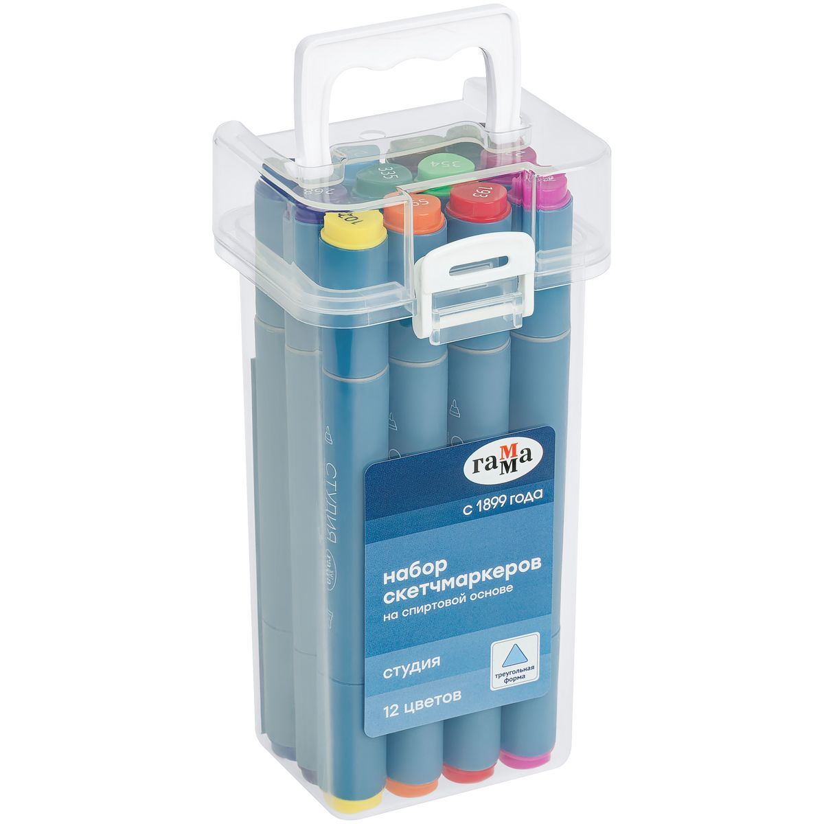 Набор двусторонних маркеров для скетчинга Гамма "Студия" 12цв., основные цвета, корпус трехгранный, пулевид./клиновид. наконечники, пласт.кейс