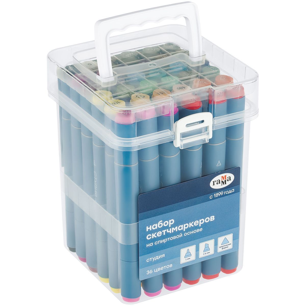 Набор двусторонних маркеров для скетчинга Гамма "Студия" 36цв., основные цвета, корпус трехгранный, пулевид./клиновид. наконечники, пласт.кейс