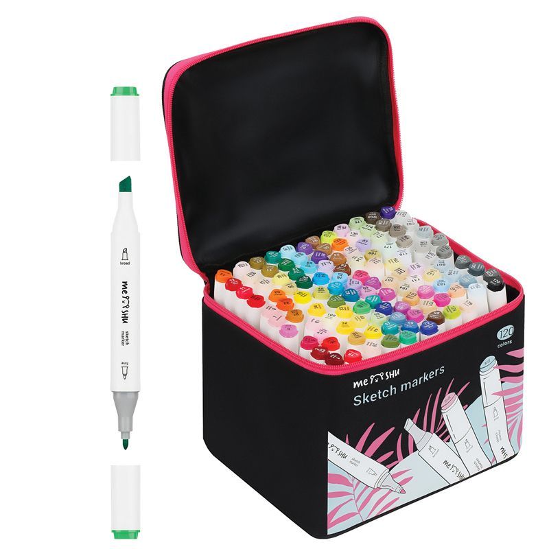 Набор двусторонних маркеров для скетчинга MESHU 120цв., основные цвета, корпус трехгранный, пулевид./клиновид.наконечники, текстильный чехол на молнии