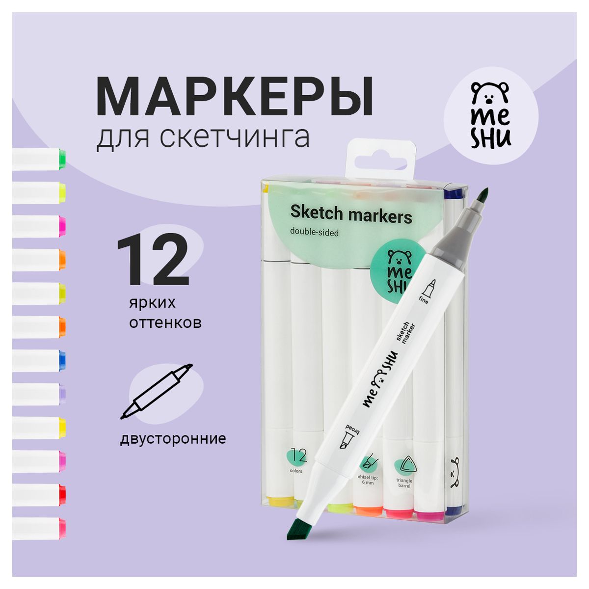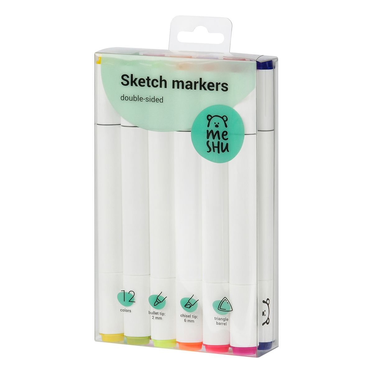 Набор двусторонних маркеров для скетчинга MESHU 12цв., основные и флуоресцентные цвета, корпус трехгранный, пулевид./клиновид.наконечники, ПВХ-бокс