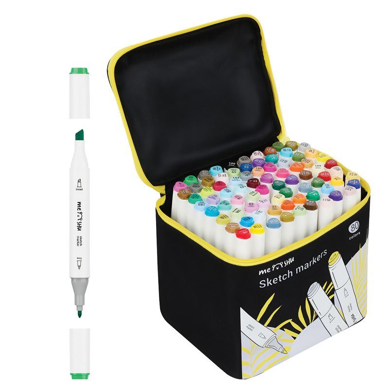 Набор двусторонних маркеров для скетчинга MESHU 80цв., основные цвета, корпус трехгранный, пулевид./клиновид.наконечники, текстильный чехол на молнии