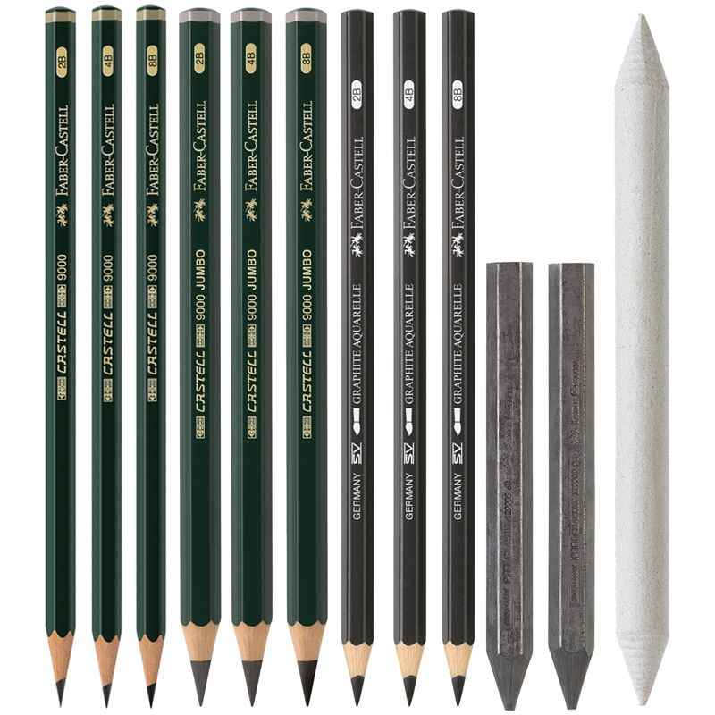 Набор состоит из 3 чернографитных карандашей Castell 9000 твердостью 2B, 4B и 8B, 3 чернографитных карандашей в утолщенном корпусе Castell 9000 Jumbo твердостью 2B, 4B и 8B, 3 акварельных чернографитных карандашей Graphite Aquarelle твердостью 2B, 4B и 8B, 3 чернографитных карандашей Pitt Graphite Pure твердостью 3B, 6B и 9B, 2 чернографитных мелков Pitt Graphite crayon твердостью 6B и 9B, кисти, 2 ластиков, точилки и растушевки.