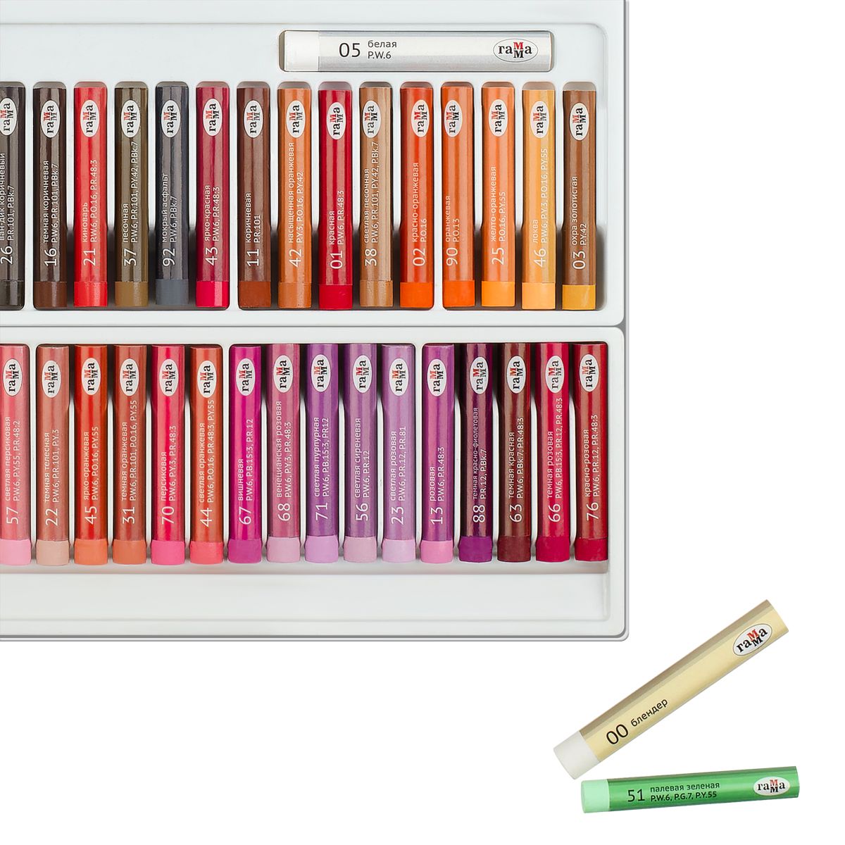 Пастель круглой формы хорошо растушёвывается. У мелков мягкая податливая структура, они оставляют густой штрих, а слои легко накладываются друг на друга. Яркие насыщенные цвета легко смешиваются, не светлеют и не темнеют со временем. Масляная пастель рисует на поверхностях разных фактур, не осыпается. Она не требует закрепления фиксативом. Каждый мелок имеет бумажную обёртку с номером цвета. Упакована в красочную и стильную картонную коробку.