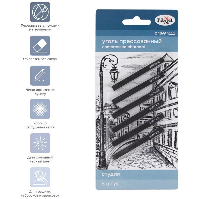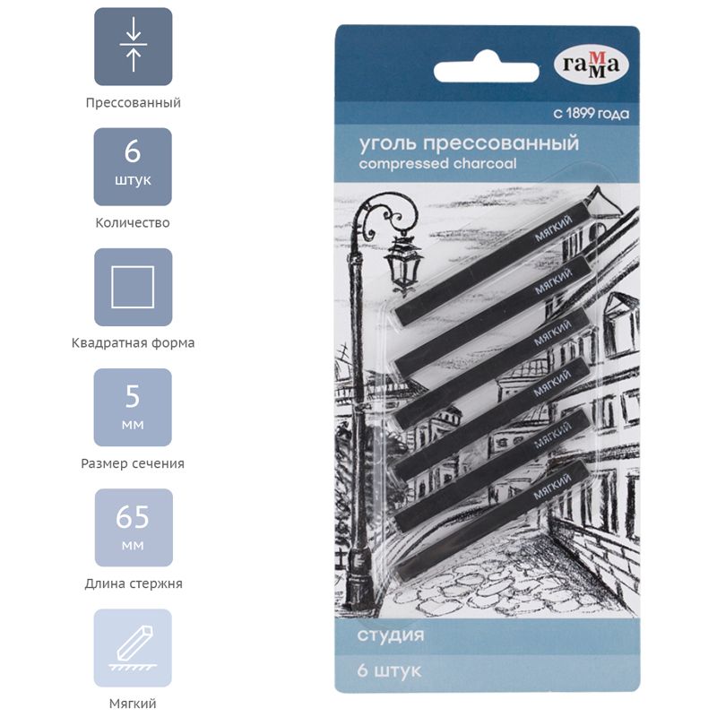 Уголь прессованный Гамма "Студия", мягкий, квадратный, 6шт., блистер, европодвес
